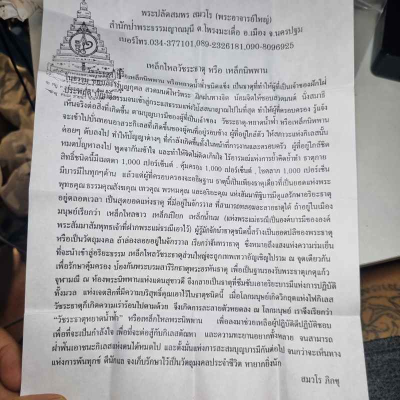 เหล็กไหลวัชระธาตุ (เหล็กไหลนิพาน) พระอาจารย์ใหญ่ สมพร สำนักป่าพระธรรมญาณมุนี จ.นครปฐม ใบฝอยและรูปเดิมจากวัด |