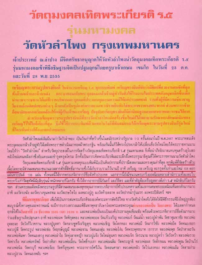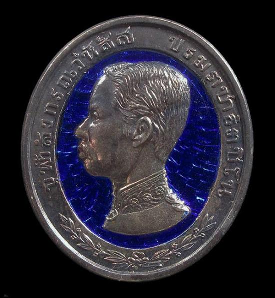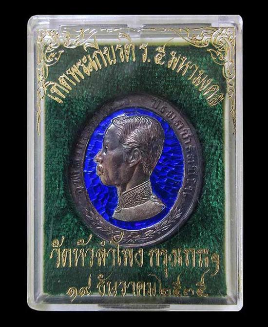 เหรียญ ร.5 ทรงยินดี วัดหัวลำโพง ปี2535 เนื้อเงินลงยาสีน้ำเงิน กล่องเดิม อธิษฐานจิตเป็นปฐมฤกษ์โดยครูบาเจ้าเกษม เขมโก