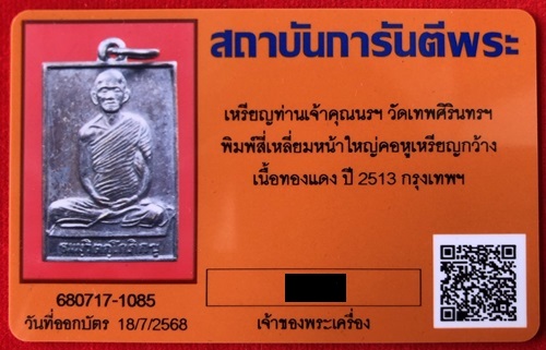 เหรียญท่านเจ้าคุณนรฯ วัดเทพศิรินทรฯ พิมพ์สี่เหลี่ยมหน้าใหญ่ เนื้อทองแดง ปี 2513 จ.กรุงเทพฯ สวยเดิม มาพร้อมบัตรรับรองครับ