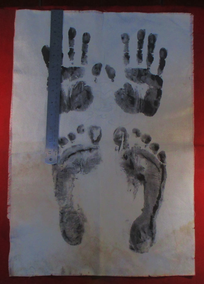 ผ้ายันต รอยมือ รอยท้าว ไม่ทราบที่ มีรอยจารยันต์ด้วยดินสอ ครับ (พระบ้าน ครับ) |
