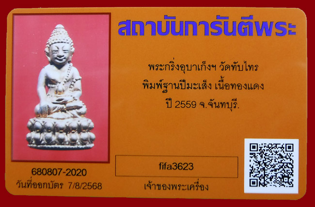 รายละเอียด แดงที่เคาะแรก !!! พระกริ่งอุบาเก็ง 12 นักษัตร ฐานปีมะโรง เนื้อทองแดง ปี2559 (ปลุกเสกวัดสุทัศน์) + บัตรพระแท้