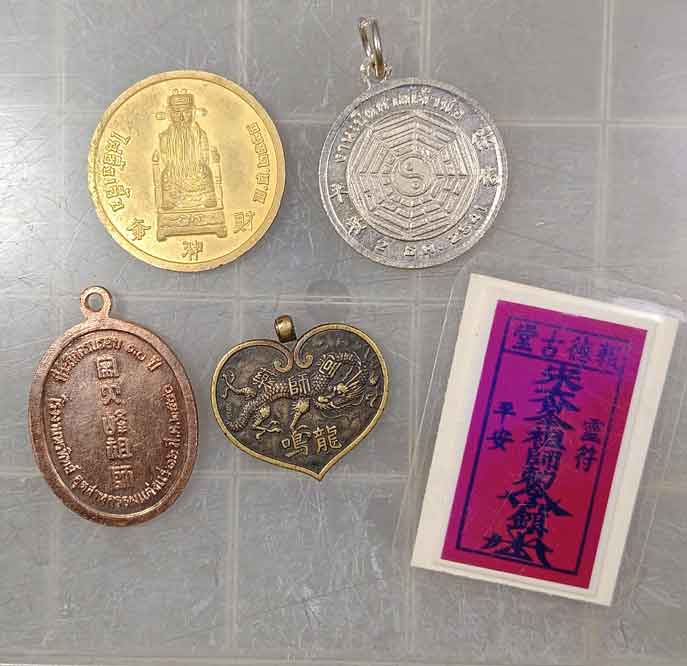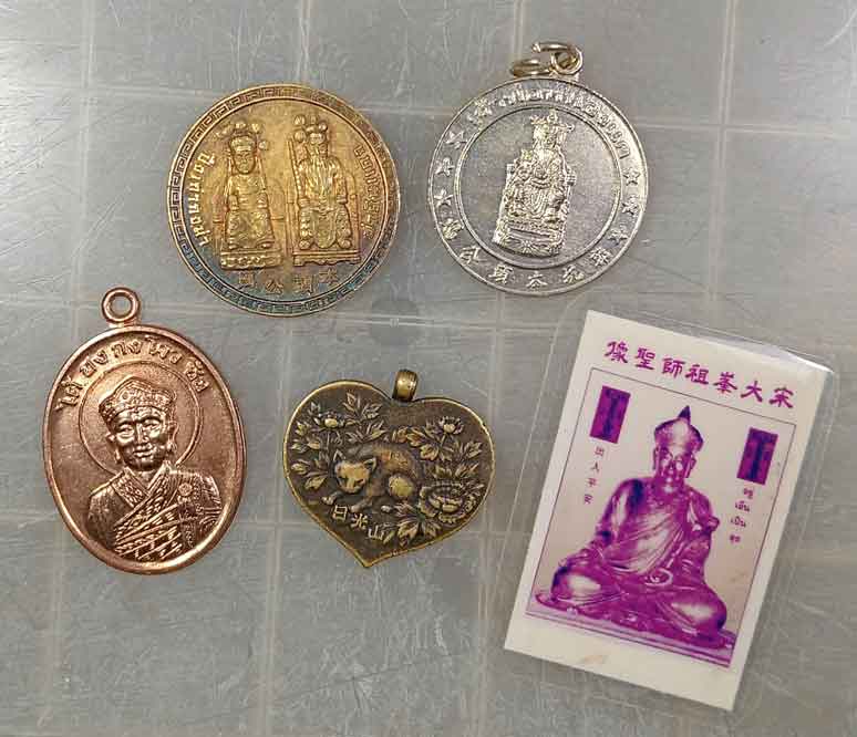 เหรียญ เทพเจ้า 3 เหรียญ +รูปถ่ายเทพเจ้า + ผ้ายันต์จีน + เหรียญมังกร |