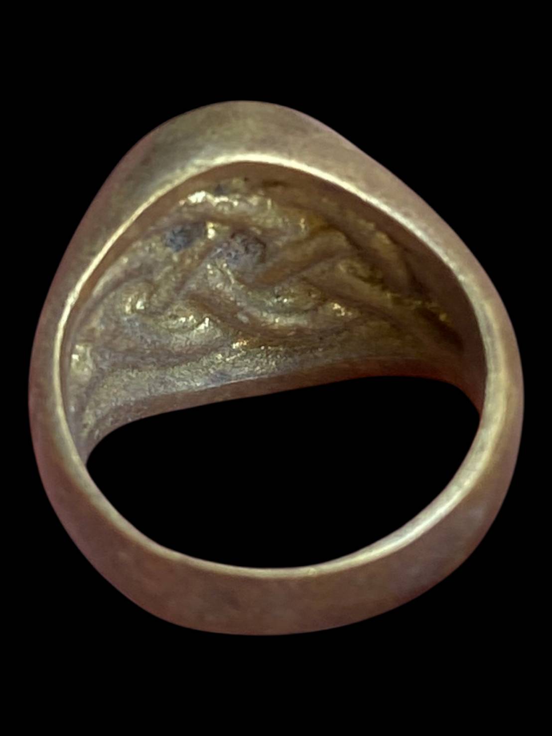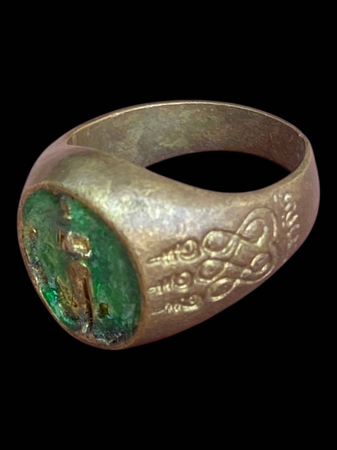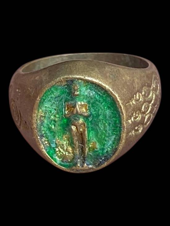 แหวนเก่าไม่ทราบที่ ลักษณะเป็นแหวนงานเก่าทรงหนา ตัวเรือนโลหะเก่ามีคราบอายุและร่องรอยการใช้งาน ผิวเดิมไม่ผ่านการขัดแต่ง หน้าแหวนฝังวัสดุสีเขียว ลวดลายภายในสึกตามกาลเวลา ด้านข้างตัวเรือนมีลายจารหรืออักขระเก่า พิจารณาตามภาพและความพอใจเป็นหลัก เหมาะสำหรับสายเครื่องรางหรือผู้ที่มองหาแหวนเก่าไว้สะสม