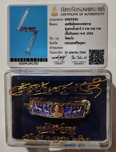 เลสข้อมือ หลวงพ่อรวย รุ่นสรงน้ำเสาร์ 5 รวย รวย รวย เนื้อเงินลงยา ปี 2563 เลข 385 วัดตะโก จังหวัดอยุธยา สภาพสวย ไม่คยผ่านการใช้งาน |