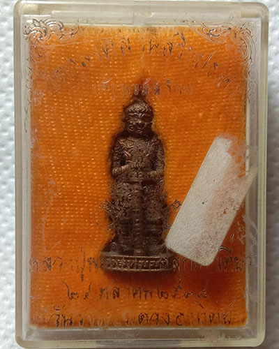 รูปหล่อท้าวเวสสุวรรณ "รุ่นแรก (รุ่นสุริยุปราคา)" เนื้อโลหะ ปี 2538 หลวงปู่พรหมา เขมจาโร วัดสวนหินผานางคอย จ.อุบลราชธานี กล่องเดิม |