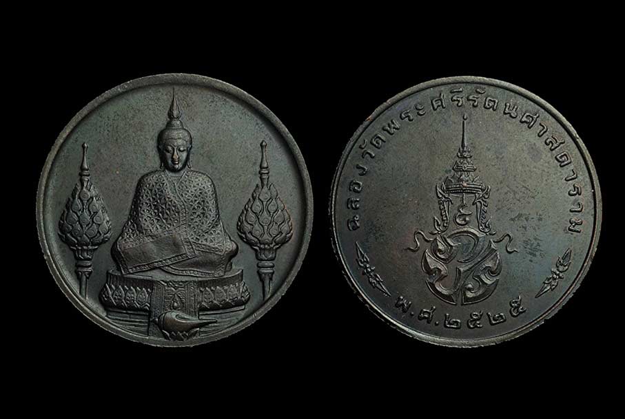เหรียญชุด พระแก้วมรกต จำนวนรวม 3 เหรียญ หลังพระปรมาภิไธยย่อ ภปร ฉลองกรุงรัตนโกสินทร์ 200 ปี พ.ศ.2525 ทรงเครื่องฤดูหนาว,ทรงเครื่องฤดูร้อน,ทรงเครื่องฤดูฝน เนื้อทองแดง
