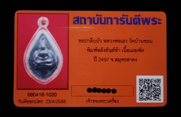 พระกลีบบัว หลวงพ่อเฮง วัดบ้านขอม เนื้อเมฆพัด พิมพ์อรุณเทพบุตรหลังยันต์ห้า ปี2497 จ.สมุทรสาคร พร้อมบัตรG... |