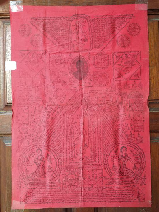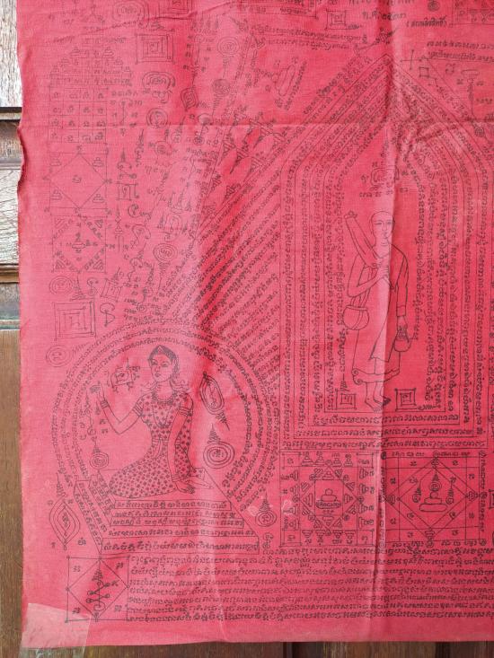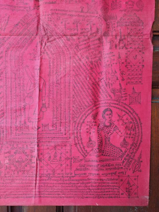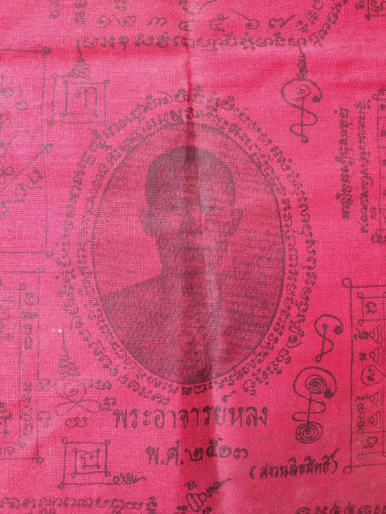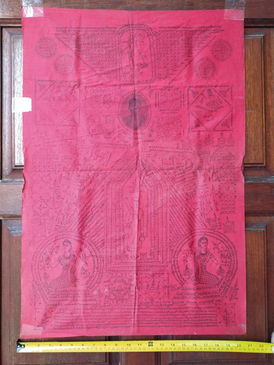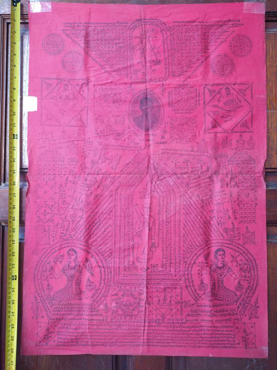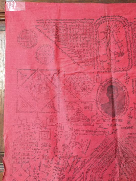 แต่ผืนจริงไม่ซีดครับ (สีแดงสดแบบรูปเต็มรูปแรกเลย) หมึกพิมพ์ยันต์อักขระติดชัดทั้งหมด ไม่จาง เจ้าของเก็บพับเดิม ๆ ไม่เคยใช้ครับ