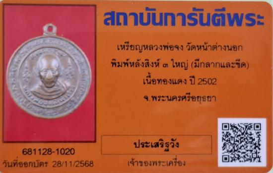 เหรียญกลม หลวงพ่อจง วัดหน้าต่างนอก พิมพ์หลังสิงห์(๓ ใหญ่ มีกลากและขีด) เนื้อทองแดง ปี2502 จ.พระนครศรีอยุธยา พร้อมบัตรจี |