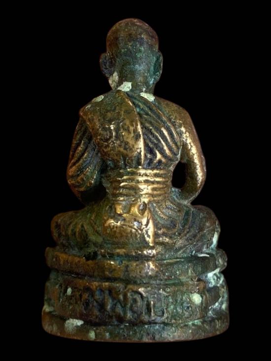 รูปหล่อหลวงพ่อเก่า ไม่ทราบที่ ลักษณะเป็นพระสงฆ์นั่งขัดสมาธิ งานหล่อโบราณ ทรงองค์สมส่วน ใบหน้ามีมิติ แสดงเอกลักษณ์งานเก่า ผิวผ่านการใช้งานยาวนาน มีคราบเก่า คราบสนิม และร่องรอยตามอายุธรรมชาติ เห็นการปิดทองเดิมหลงเหลือบางจุด เนื้อดูแห้งเก่า ไม่ผ่านการแต่งหรือขัดผิว สภาพตามการใช้งานจริง เหมาะสำหรับสายรูปหล่อเก่า สายสะสม หรือบูชาติดตัว
