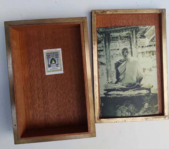 ภาพ หลวงพ่อน้อย อินทสาโร วัดธรรมศาลา กับกล่องไม้โบราณหุ้มด้วยโลหะ ลวดลายนูนต่ำ |