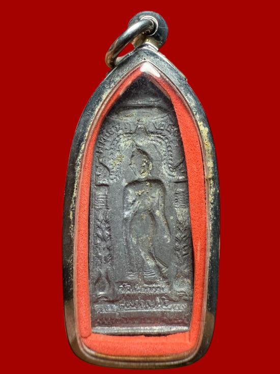 พระลีลากำแพงนิ้วซุ้มฉัตร เนื้อชิน หลวงพ่อขอม วัดไผ่โรงวัว ปี 2505