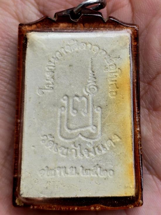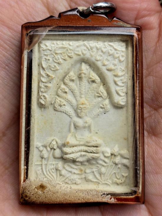 พระสมเด็จนาคปรกมุจลินทร์ หลวงพ่อยงยุทธ วัดเขาไม้แดง จ.ชลบุรี เนื้อผง ปี 2520 เลี่ยมพลาสติกโบราณ รอยไหม้มีแค่กรอบด้านหน้า ไม่กระทบพระด้านใน |