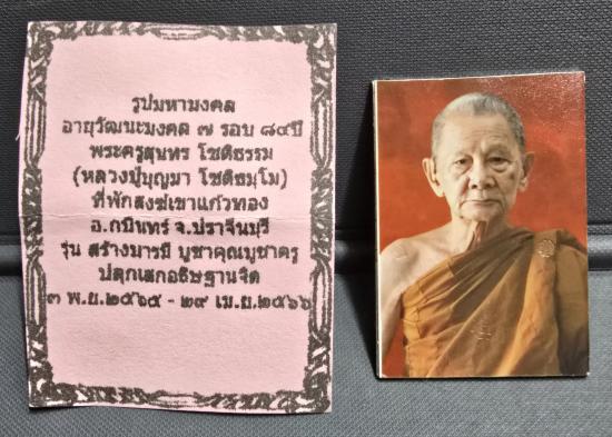 รูปถ่าย รุ่น"สร้างบารมี" หลวงปู่บุญมา โชติธัมโม วัดเขาแก้วทอง ปราจีนบุรี รูปถ่ายหลวงปู่(องค์กรรมการ สร้าง 99 องค์) ตอกโค๊ดบนรูป 3 โค๊ด ตอกโค๊ดใบโพธิ์รอบ โค๊ด"ก" และอื่นๆ มีจารมือด้านหลัง ติดตระกรุดหล |