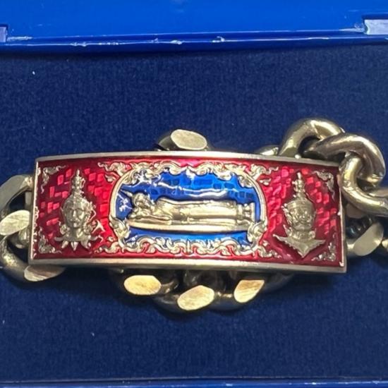 เลสข้อมือ ท้าวเวสสุวรรณจาตุมหาราชิกา หลวงพ่อพระนอนศักดิ์สิทธิ์ วัดพระนอนแม่ปูคา จ. เชียงใหม่ ครูบากฤษดา ร่วมปลุกเสก เนื้ออัลปาก้า ลงยาแดงน้ำเงิน เลข 121 ยาว 7 นิ้ว |