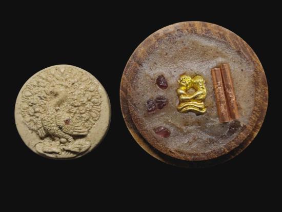พญายูงคำ รุ่นแรก เนื้อเกสรทั้งห้า และ ตลับไม้สีผึ้งเนื้อหอม รังผึ้งร้าง ขวางเดือนขวางตะวัน รุ่นแรก ฝังอิ่น ตะกรุด ในเมตตาบารมี เจ้าปู่จั่นต่า กาวิสาละ พญานกยูง ขนาดเท่าเหรียญสิบบาท