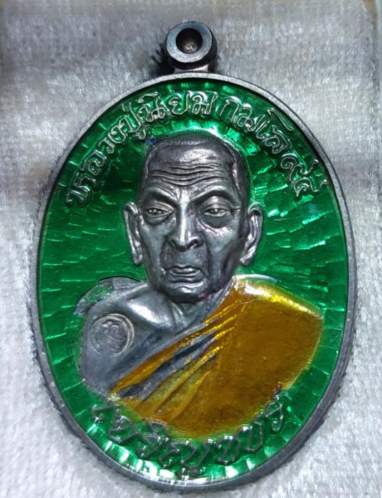 เหรียญเจริญพรเมตตามหานิยม หลวงปู่นิยม กมโล เนื้อเงินลงยาเขียว วัดแจ้งนอก ปี 2555