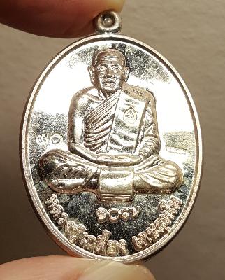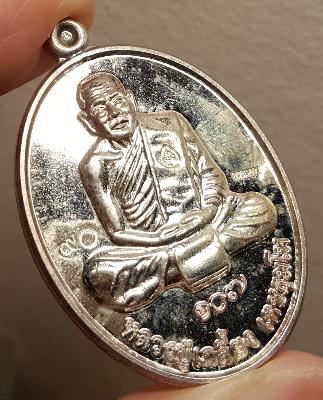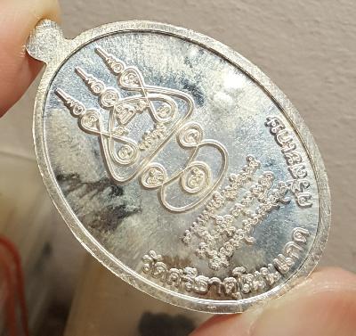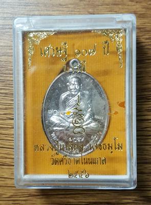 เหรียญรูปไข่เนื้อเงิน ผิวกระจก หลวงปู่เกลี้ยง วัดโนนแกด เศรษฐี ๑๐๗ ปี หมายเลข ๙๐ พร้อมกล่องเดิม