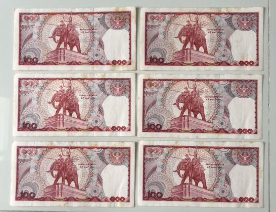 ธนบัตร แบงค์ 100บาท รัชการที่9 หลังสมเด็จพระนเรศวรมหาราชทรงช้างศึก หลังช้างแดง จำนวน 6 ใบ (มีติดเหลือง) |
