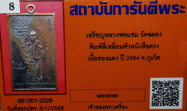เหรียญหลวงพ่อแช่ม วัดฉลอง พิมพ์สี่เหลี่ยมตัวหนังสือตรง เนื้อทองแดง ปี2484 จ.ภูเก็ต + บัตรG-pra สภาพเดิมค่ะ |