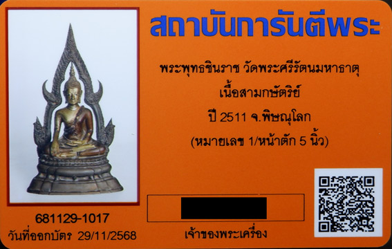 พระบูชา พระพุทธชินราช ปี 2511 วัดพระศรีรัตนมหาธาตุ เนื้อ 3กษัตริย์ จ.พิษณุโลก ขนาดหน้าตัก 5นิ้ว (2ถอด) หมายเลขประจำองค์ เลข1 องค์แรกสุด "Number ONE" + บัตรรับรอง G-Pra
