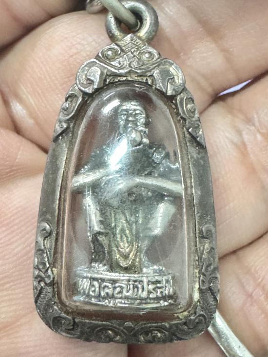 รูปหล่อเหมือน หลวงพ่อคูณ วัดบ้านไร่ นครราชสีมา ปี 2536 เนื้อเงิน พิมพ์นั่งยองเอกลักษณ์ เลี่ยมจับขอบเงินเก่า