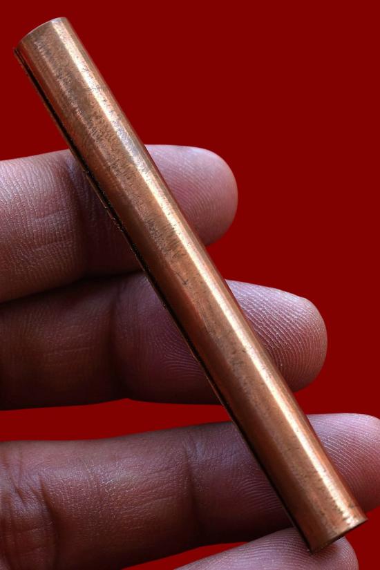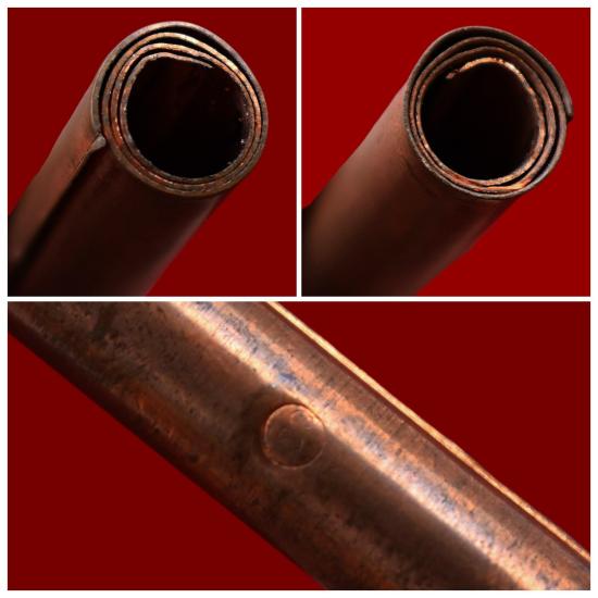 *** วัดใจ 300 แดง *** ตะกรุดเนื้อทองแดง ออกทำบุญสร้างศาลาทรงไทย ประมาณปี 255...ต้นๆ หลวงพ่อชำนาญ ออกวัดบางกุฎีทอง จ.ปทุมธานี สภาพพระตามรูปที่ลงทุกประการ (ขนาดยาวประมาณ 7.9 ซม.)