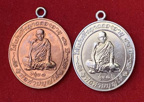 เหรียญห่วงเชื่อมรุ่นแรก ที่รฤกฉลองอายุ 82 ปี พ่อท่านบุญให้ วัดพรหมมัญพงศาราม จ.นครศรีธรรมราช เนื้ออัลปาก้า +ทองแดง หมายเลข ๔๔ |