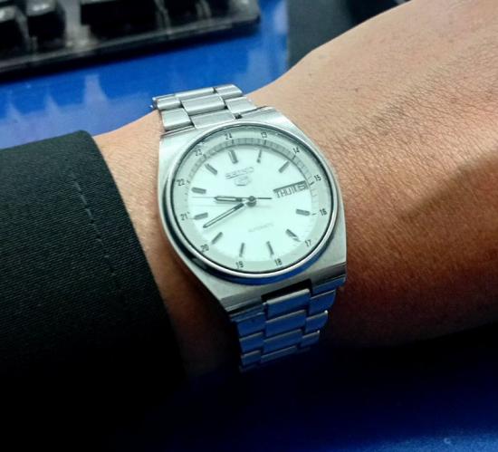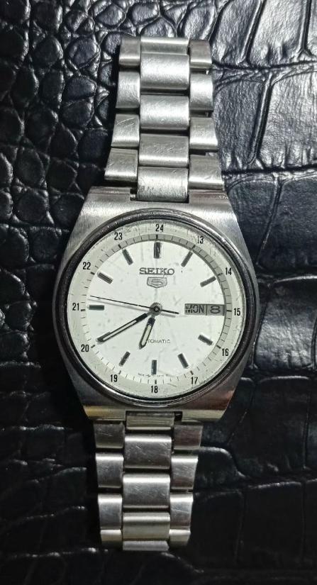 วินเทจทรงเท่ๆ..Seiko 5 หน้าขาว Automatic 7009 467R ขนาด 37 mm.โดยประมาณ วันที่ปลี่ยนเร็วได้ สายยาวๆ เดินปกติพร้อมใช้ พิจารณาก่อนเคาะรายละเอียดตามภาพครับ