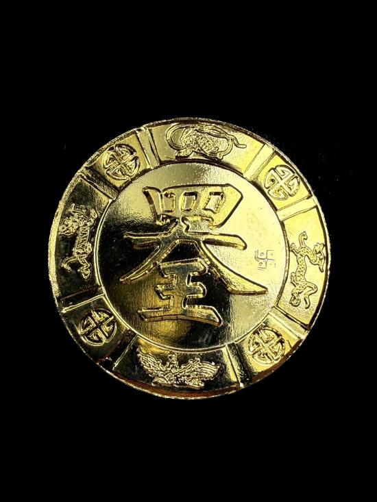 เหรียญท้าวจตุโลกบาล (สี่ไต่เทียนอ๋อง) เนื้อกะไหล่ทอง วัดมังกรเล่งเน่ยยี่ พิมพ์เล็ก