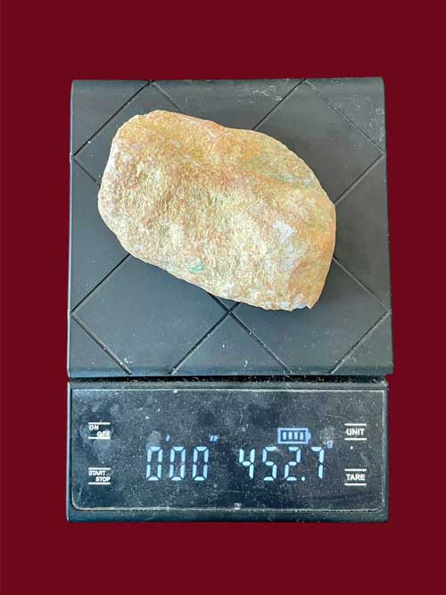 ก้อนหยกดิบจากพม่า เจาะเอาเปือกเนื้อออก ส่องด้วยไฟแรงสูง มีสีเขียว และ ม่วงออกชมพู น้ำหนัก 452.7กรัม |