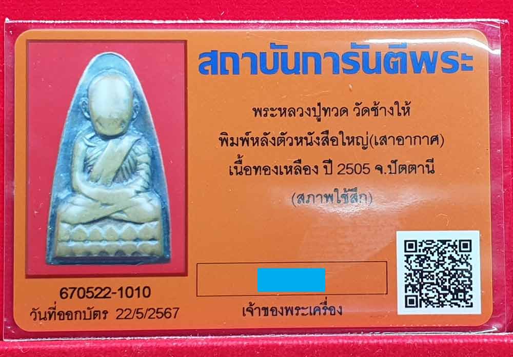 หลวงปู่ทวด วัดช้างให้ พิมพ์หลังตัวหนังสือใหญ่ (เสาอากาศ) เนื้อทองเหลือง ปี2505 จ.ปัตตานี