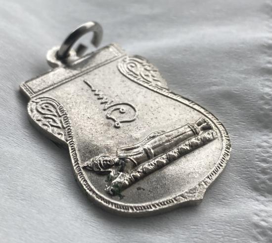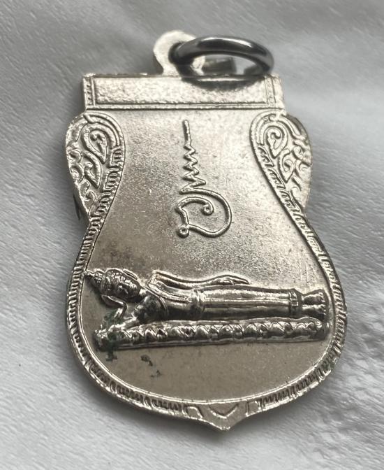 เหรียญเสมาหน้าเลื่อน หลวงปู่ทวด หลังพระนอน แจกปีนัง เนื้ออัลปาก้าชุบนิเกิล ปี 2508 |
