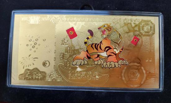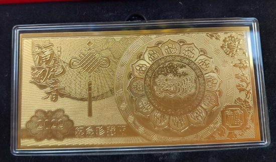 แผ่นการ์ดทอง ที่ระลึกปีเสือ 2022 กับ ลูกธนูศักดิ์สิทธิ์ของญี่ปุ่น ซึ่งเป็นเครื่องรางที่ใช้สำหรับปัดเป่าสิ่งชั่วร้ายและนำโชคดีมาให้ |
