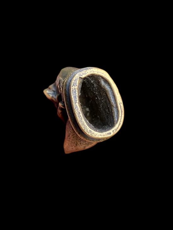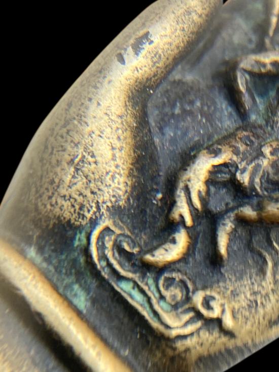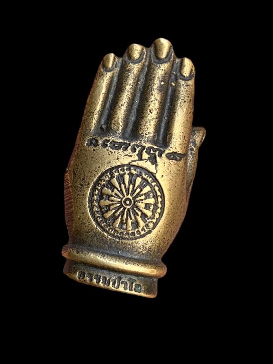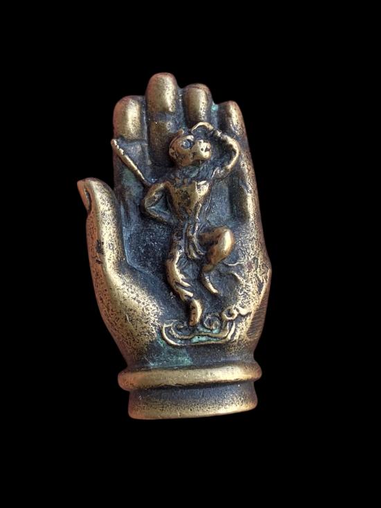 เครื่องรางรูปมือพระ เนื้อโลหะหล่อเก่า ด้านหน้าปรากฏลายรูปวานรยืนอยู่กลางฝ่ามือ ลักษณะท่วงท่าคล้ายท่าก้าวเดินหรือยกมือ บริเวณพื้นด้านล่างมีลายเส้นและลวดลายประกอบ ด้านหลังเป็นฝ่ามือเรียบ มีลายวงล้อธรรมจักรกลางฝ่ามือ และอักขระโบราณหล่อเดิมติดอยู่เหนือวงล้อ ฐานด้านล่างเป็นทรงกระบอกกลวง ภายในกลวงตามแบบงานหล่อโบราณ ผิวองค์มีคราบเก่า คราบออกซิเดชัน และร่องรอยการใช้งานตามอายุ ไม่ผ่านการล้างหรือแต่งเพิ่มเติม เหมาะสำหรับสายเครื่องรางโบราณ สายศิลป์พื้นบ้าน หรือผู้ที่สะสมงานหล่อเก่าเชิงความเชื่อ