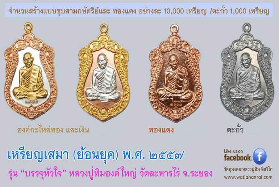 เหรียญเสมา ย้อนยุค หลวงปู่ทิม ปี57 รุ่นบรรจุหัวใจ " วาระแรก " เลขสวย 5999 เนื้อ 3 K กะไหล่ เงิน ทอง นาค |