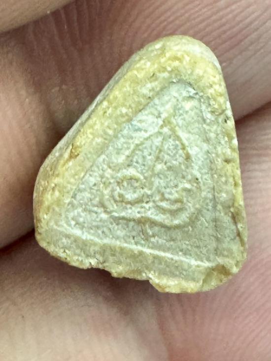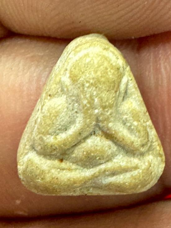 พระปิดตาหลังใบโพธิ์ นะมิ พิมพ์สามเหลี่ยมเล็กเนื้อผงน้ำมัน หลวงปู่สี วัดเขาถ้ำบุญนาค พ.ศ. 2517