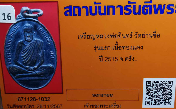เหรียญหลวงพ่ออินทร์ วัดย่านซื่อ รุ่นแรก เนื้อทองแดง ห่วงเดิม ปี2515 จ.ตรัง + บัตร G-pra สภาพเดิมค่ะ สภาพตามรูปทุกประการค่ะ