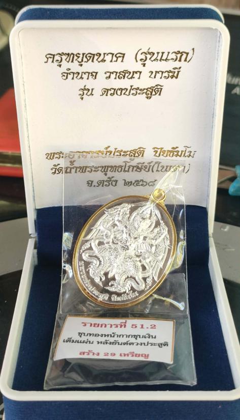 เหรียญครุฑหยุดนาค รุ่นแรก"ดวงประสูติ"หลวงพ่อประสูติ ปิยธัมโม วัดถ้ำพระพุทธโกษีย์(ในเตา)จ.ตรัง เนื้อชุบทองหน้ากากชุบเงินเต็มแผ่น หลังยันต์ดวงประสูติ หมายเลข ๑๑ พร้อมกล่อง (สร้าง๒๙เหรียญ) |