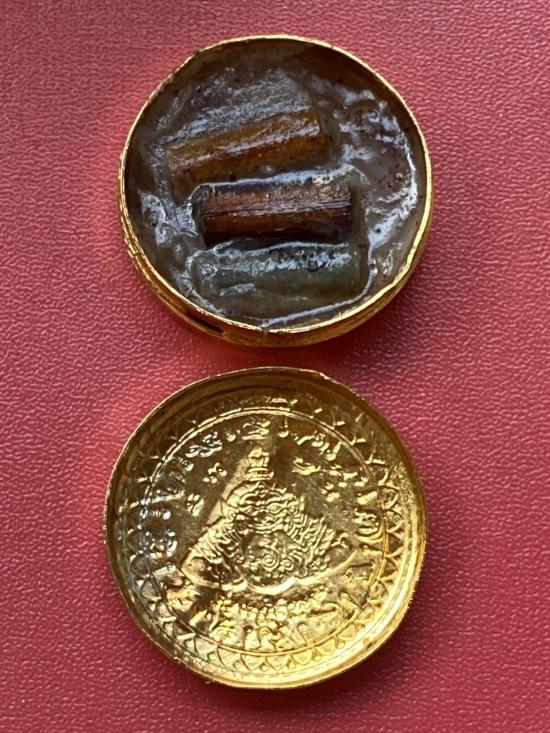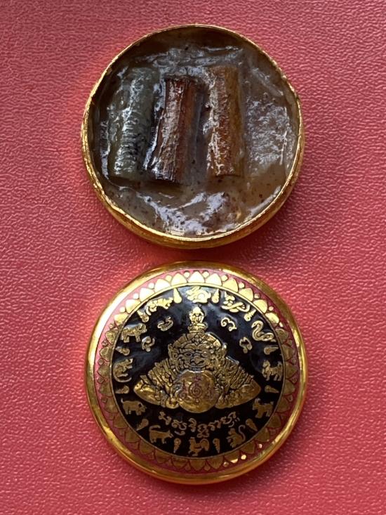 เคาะเดียวแดง สีผึ้งพระราหู รุ่น มงคลจักรวาล เนื้อ โลหะชุบทองลงยาสีดำขอบสีแดง ขนาด3.2ซม |