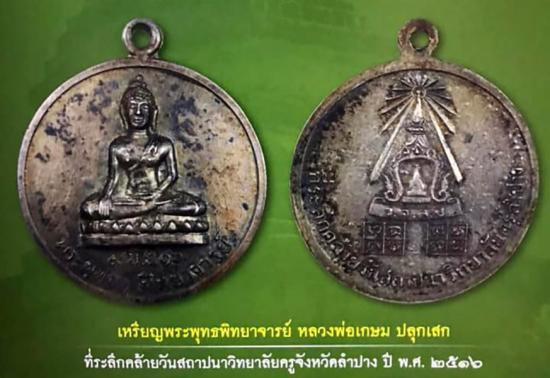 เหรียญพระพุทธพิทยาจารย์ ที่ระลึกคล้ายวันสถาปนาวิทยาลัยครูลำปาง(ว.ค.ล.ป.) ปลุกเสกปี 16 เนื้อทองแดง ( พิธีเดียวกันกับเหรียญระฆัง ปี16 อันโด่งดังของหลวงพ่อเกษม เขมโก ) |