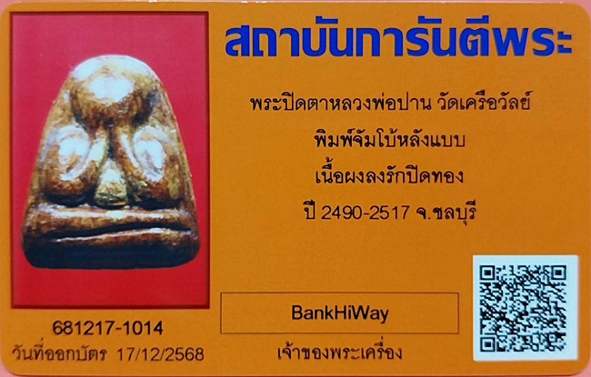รายละเอียด พระปิดตาหลวงพ่อปาน วัดเครือวัลย์ พิมพ์ใหญ่จัมโบ้หลังแบบ เนื้อผงลงรักปิดทอง ปี2490-2517
