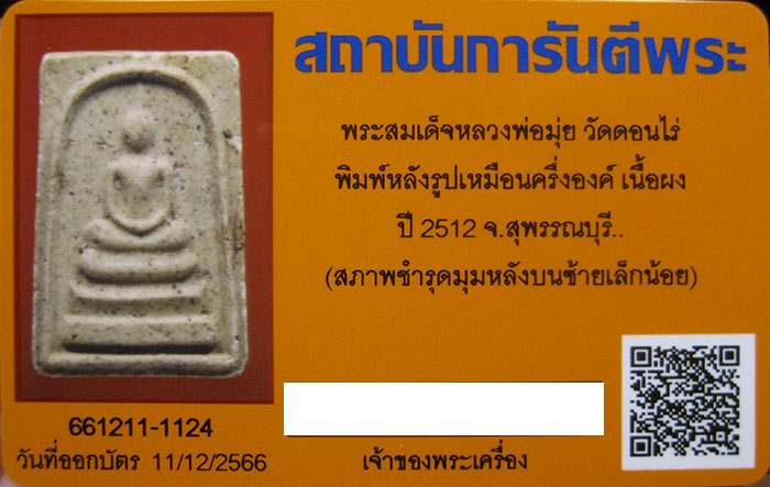 พระสมเด็จ พิมพ์ทรงเจดีย์ หลังรูปเหมือนครึ่งองค์ หลวงพ่อมุ่ย วัดดอนไร่ จ.สุพรรณบุรี ปี12 พร้อมบัตรรับรอง |