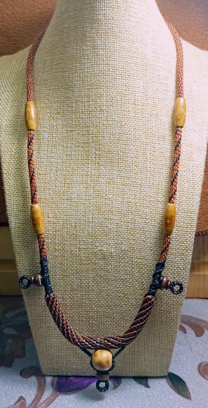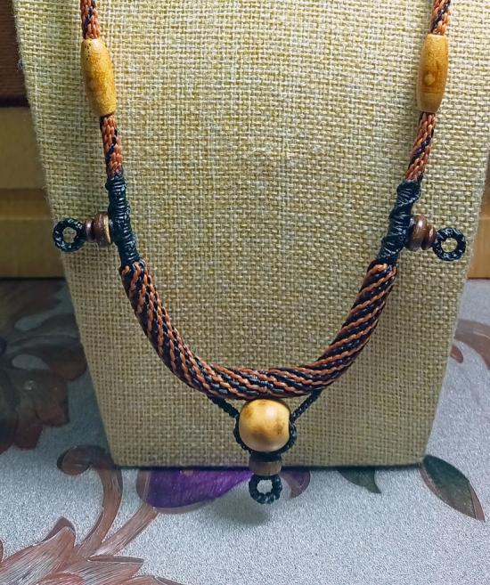 สร้อยคอเชือกเทียน งานถักมือ ( สีน้ำตาล แซมดำ + แซมลูกปัดไม้ธรรมชาติ ห้อยพระ 3 องค์ ) ยาว24นิ้ว ครับ |
