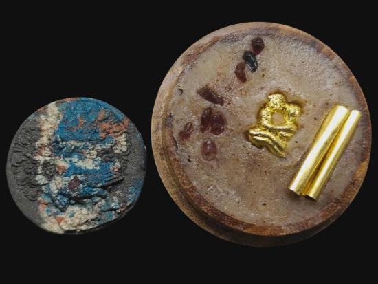 พญายูงคำ รุ่นแรก เนื้อก้นครก และ ตลับไม้สีผึ้งเนื้อหอม รังผึ้งร้าง ขวางเดือนขวางตะวัน รุ่นแรก ฝังอิ่น ตะกรุด ในเมตตาบารมี เจ้าปู่จั่นต่า กาวิสาละ พญานกยูง ขนาดเท่าเหรียญสิบบาท