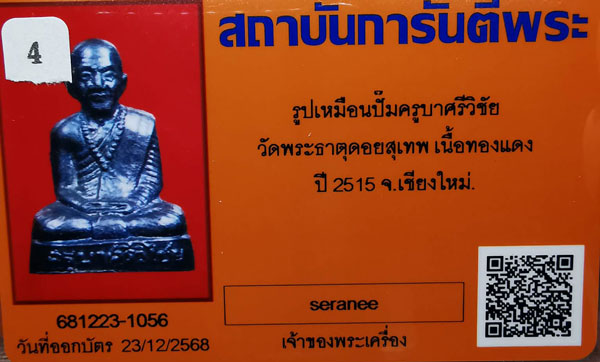 รูปเหมือนครูบาศรีวิชัย วัดพระธาตุดอยสุเทพ เนื้อทองแดง ปี2515 จ.เชียงใหม่ + บัตรG-pra สภาพเดิมค่ะ |