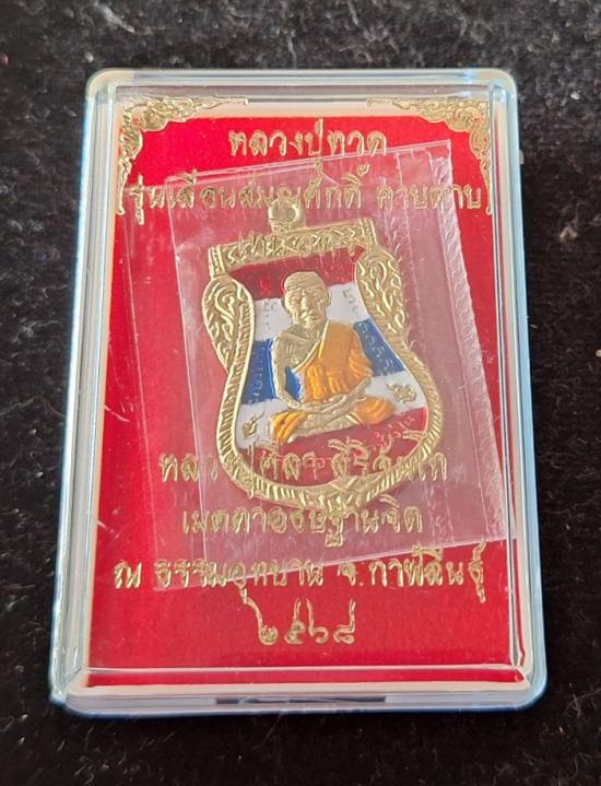 วัดใจ หลวงปู่ทวด หลวงปู่ศิลา เมตตาอธิษฐานจิต รุ่นเลื่อนสมณศักดิ์ เหนือดวง เนื้อทองทิพย์ ลงยาลายธงชาติ No.403 |