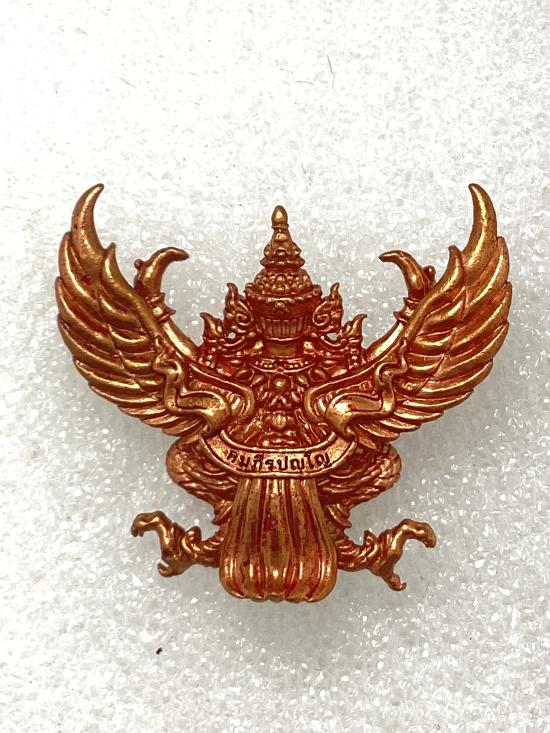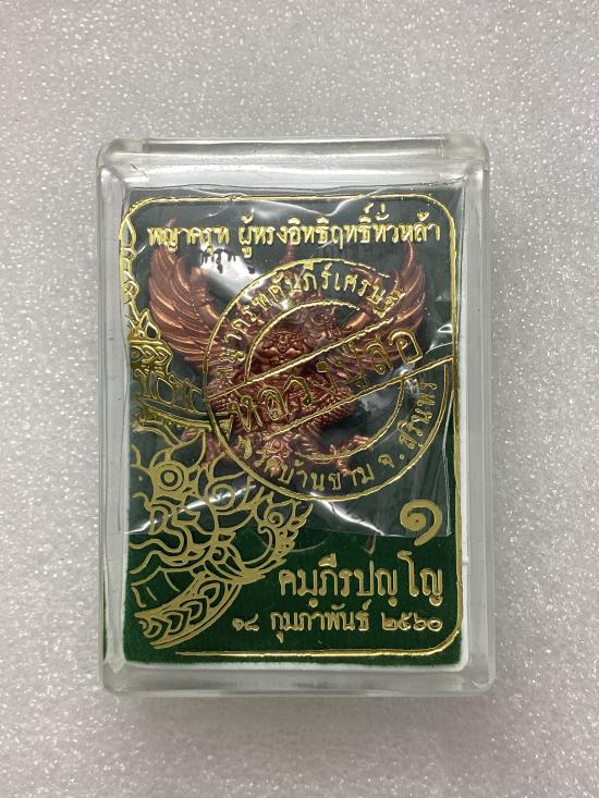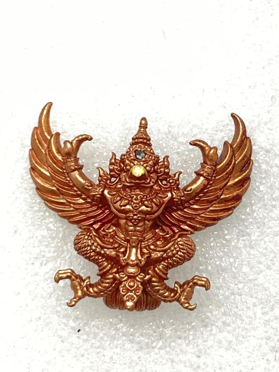 พญาครุฑ รุ่นคัมภีร์เศรษฐี หลวงปู่สอ วัดสัทธารมย์ (วัดบ้านขาม) อ.จอมพระ จ.สุรินทร์ เนื้อทองแดงเถื่อน ปากทอง สูง 3 ซ.ม. กล่องเดิม |