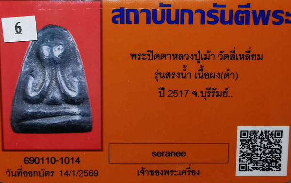 พระปิดตาหลวงปู่เม้า วัดสี่เหลี่ยม รุ่งสรงน้ำ เนื้อผง(ดำ) ปี2517 จ.บุรีรัมย์ + บัตรG-pra สภาพสวยเดิมค่ะ