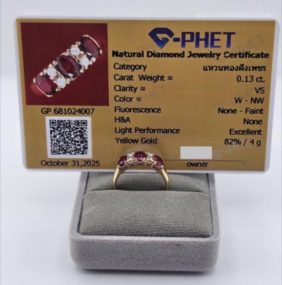 แหวนทับทิมฝังเพชร 0.13 ct. ตัวเรือนทองน้ำหนัก 4 กรัม 82% เบอร์ 53 **พร้อมใบเซอร์การันตีเพชร**
